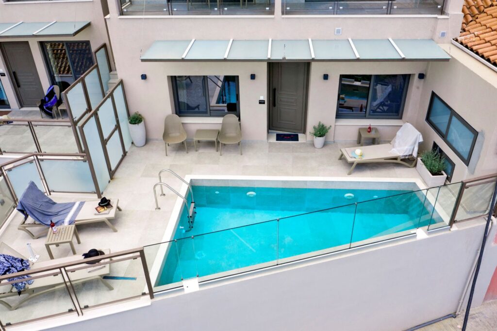 Luxury suites that can accommodate up to 6 persons. They include 2 bedrooms with double bed and in the living room there are 2 very comfortable sofas for 2 more persons. This charming suite with private swimming pool is located in the center of Vlycho with amazing view to the Ionian sea. It includes bathroom with shower, fully equipped kitchen, flat-screen TV, A/C, free wifi in the whole area and a spacious living room is offered for happy relaxing moments with friends and family.