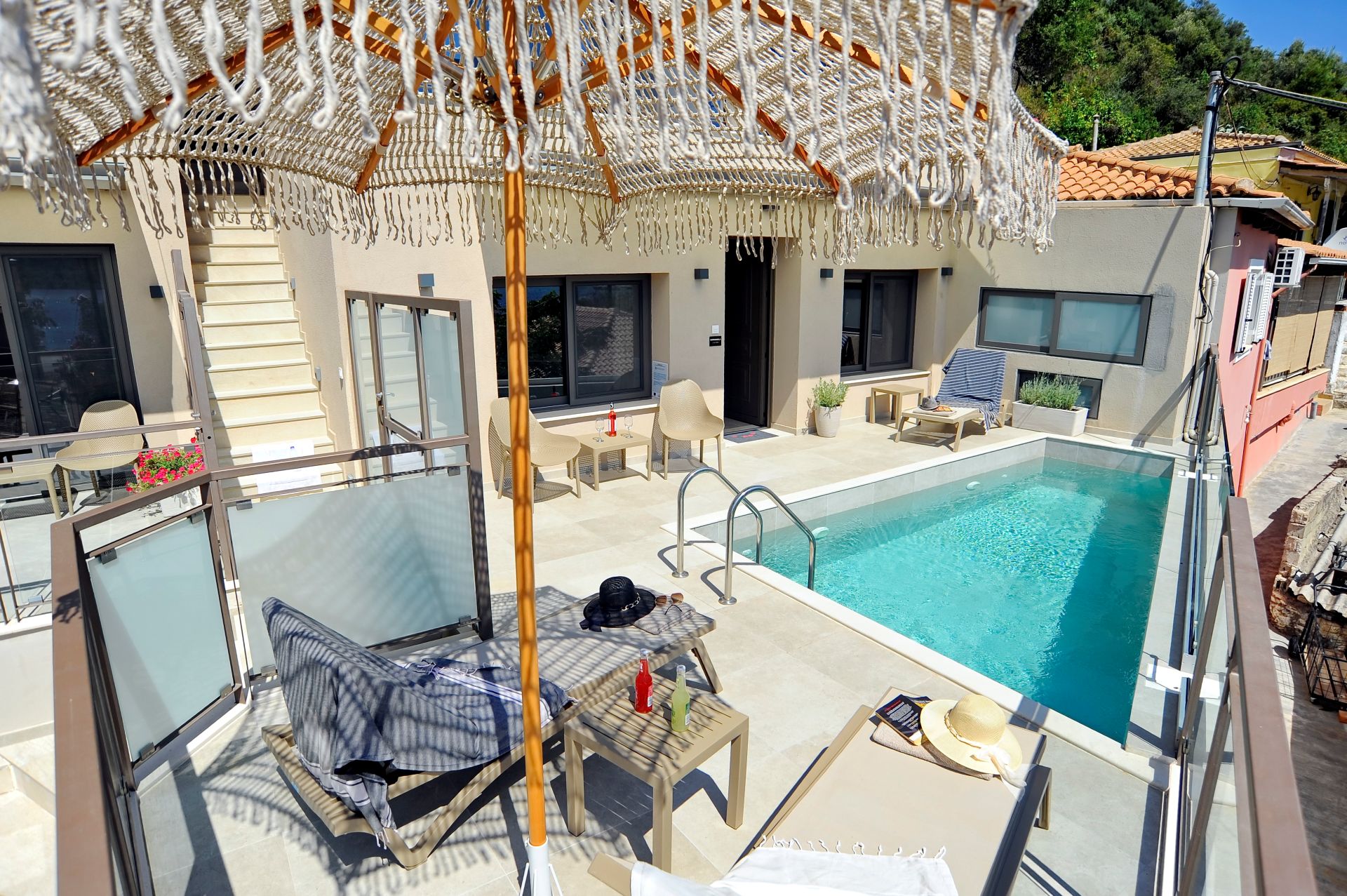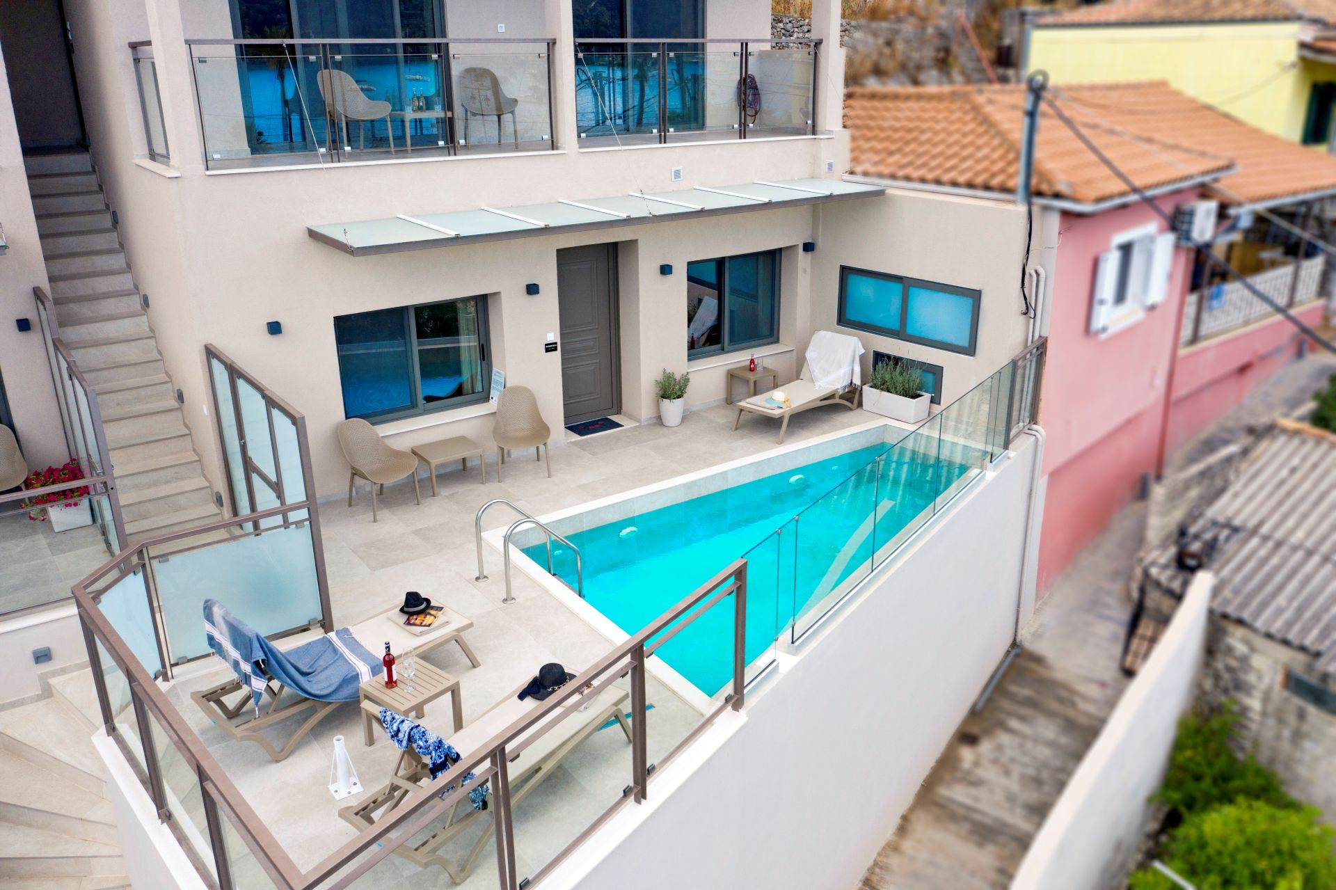 Luxury suites that can accommodate up to 6 persons. They include 2 bedrooms with double bed and in the living room there are 2 very comfortable sofas for 2 more persons. This charming suite with private swimming pool is located in the center of Vlycho with amazing view to the Ionian sea. It includes bathroom with shower, fully equipped kitchen, flat-screen TV, A/C, free wifi in the whole area and a spacious living room is offered for happy relaxing moments with friends and family.